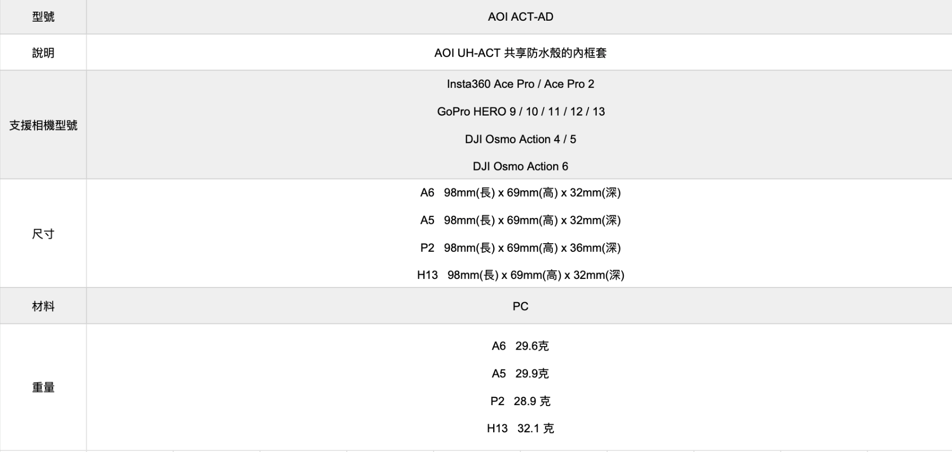 AOI ACT-AD 運動相機內框套適用於 AOI UH-ACT 共享防水殼,可相容多款運動相機型號。