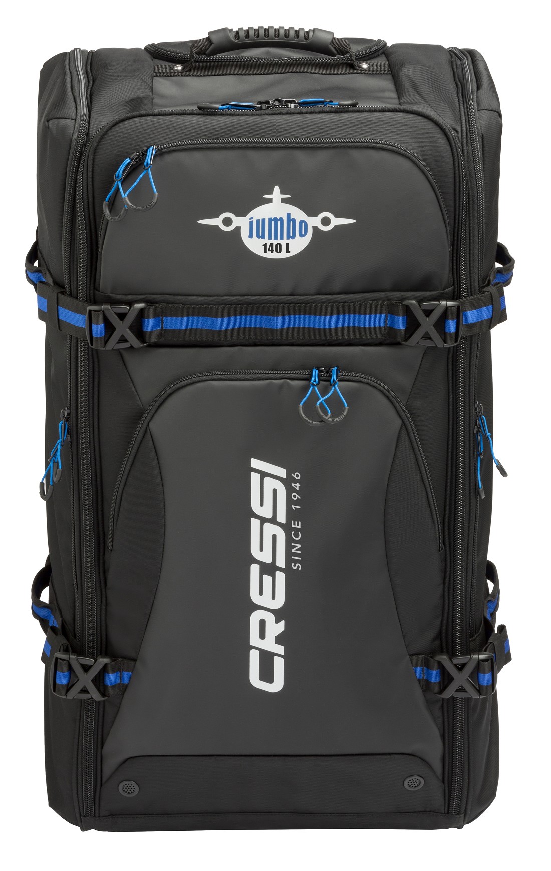 Cressi Jumbo 的大容量(140 升)和內部隔層使行李更容易分類。外面兩個側邊口袋,各可容納一雙最大尺寸 XXL 的蛙鞋。兩個前方袋子方便收納其他物品。