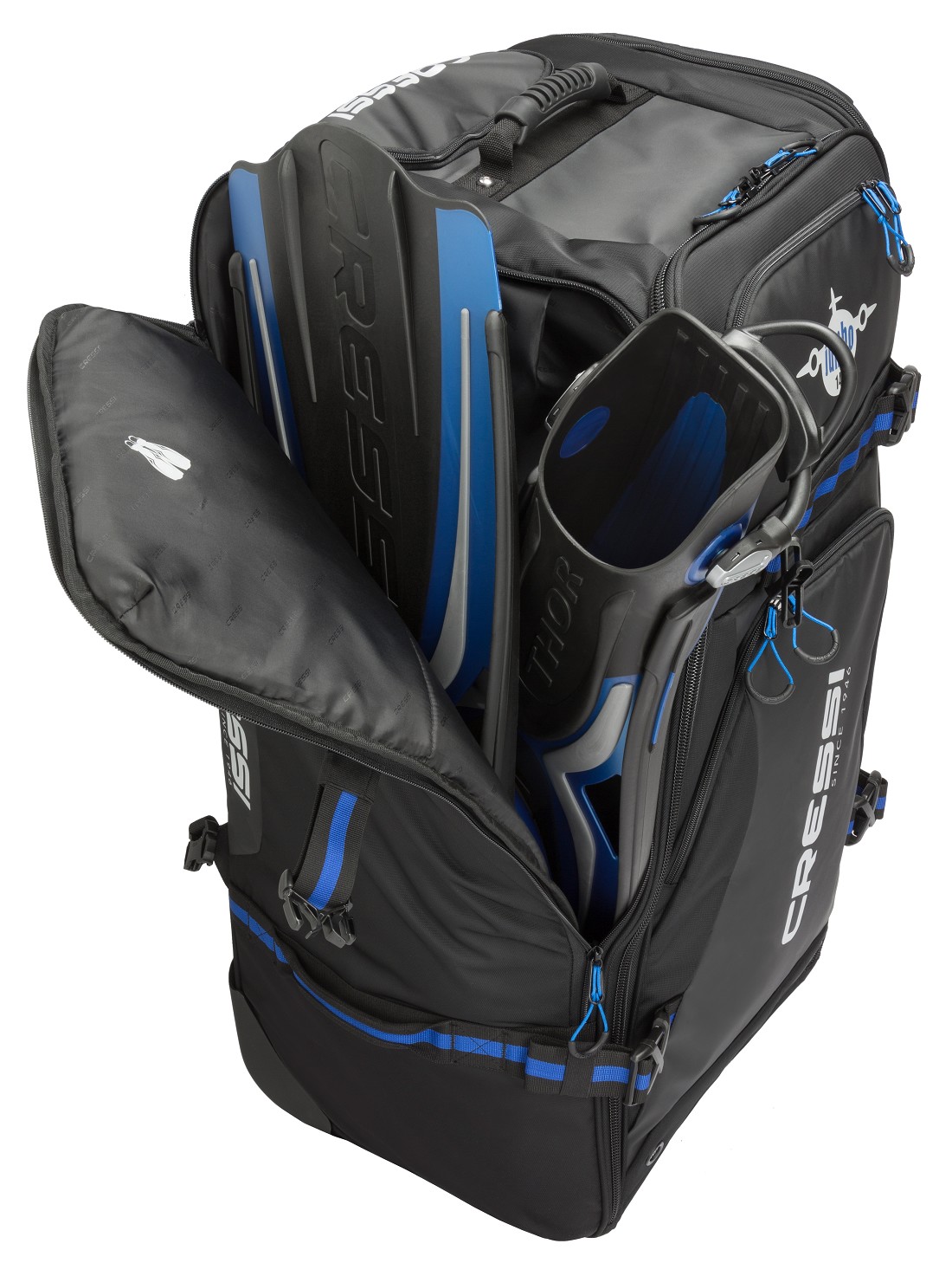 The ample volume (140 liters) and the internal partitioning make the luggage easy to prepare. The two side pockets, with the fin logo inside, can hold a pair of large fins, up to size XXL. The two front pockets are handy for packing accessories, like towels, t-shirts, and sunglasses.