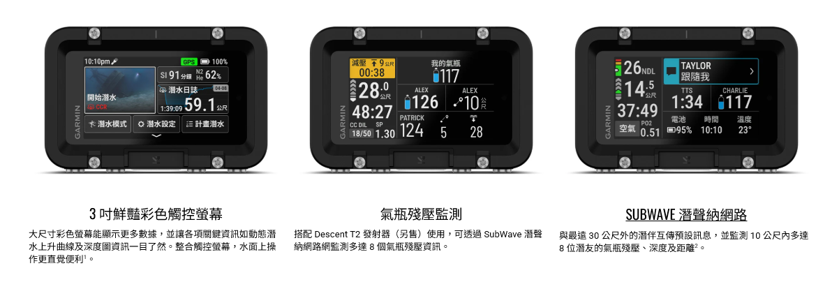 - SubWave™ 潛聲納通訊:搭配 Descent T2 發射器(需另購),可在水下互傳訊息並監測多至 8 支氣瓶壓力與距離資訊。
