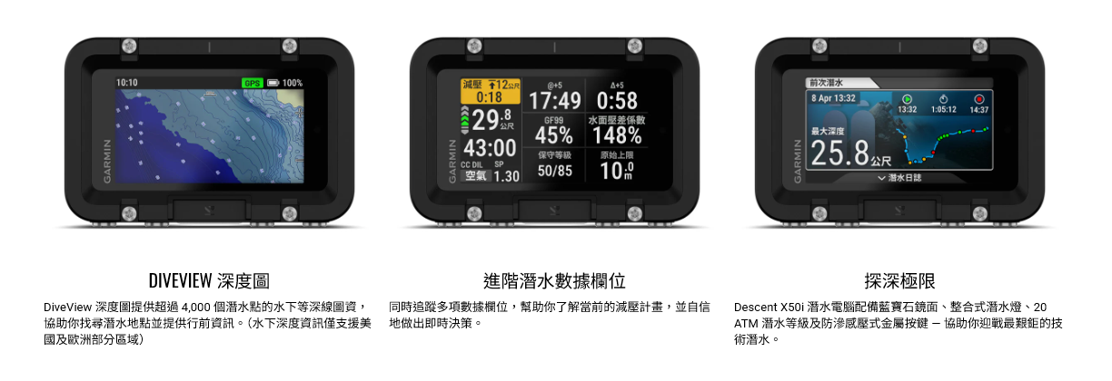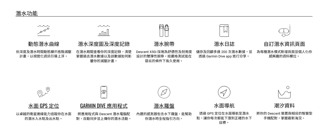 - Surface GPS 可記錄入水/出水點,並與 Garmin Dive App 同步潛水日誌與地點。